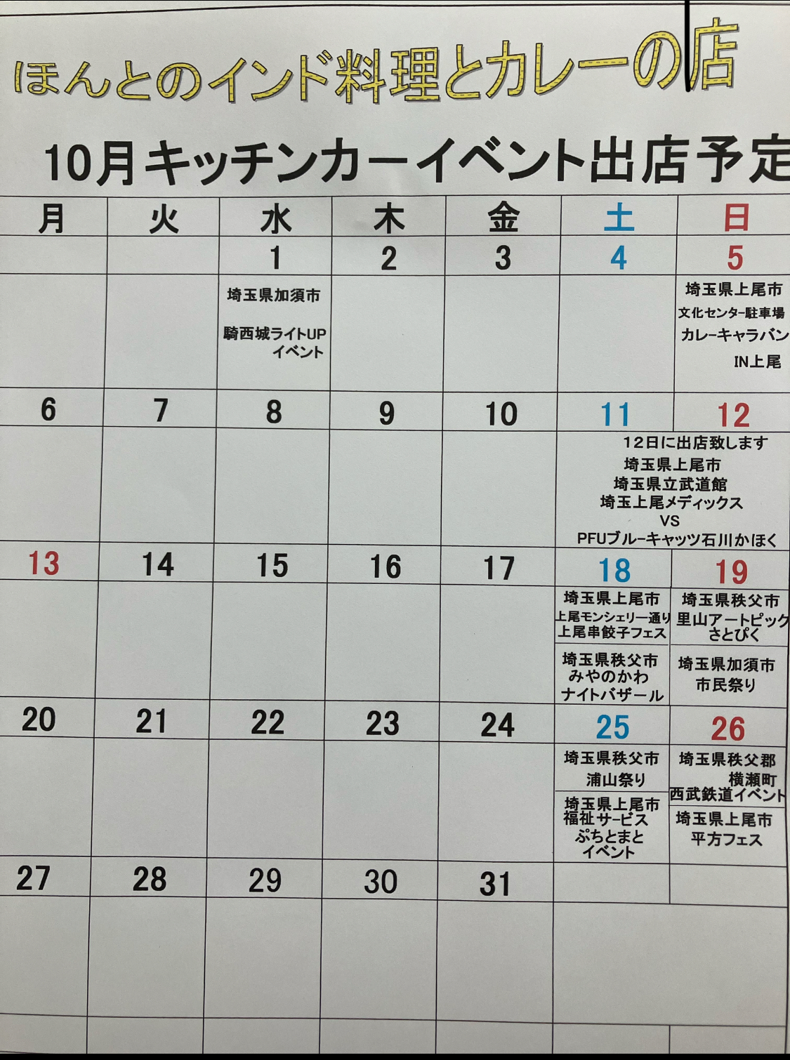 10月のキッチンカーイベント出店予定は下記の通りです。